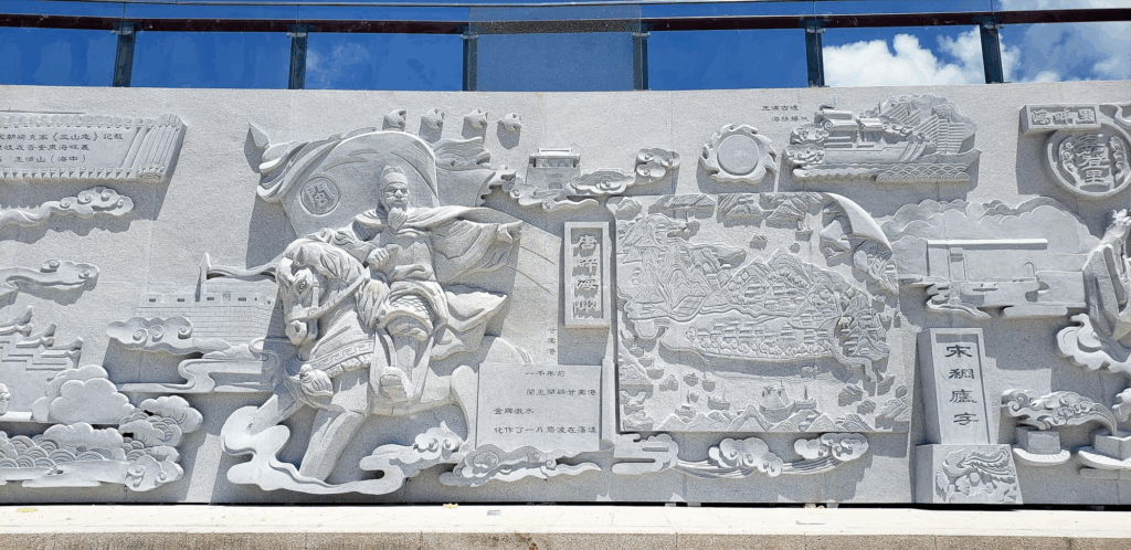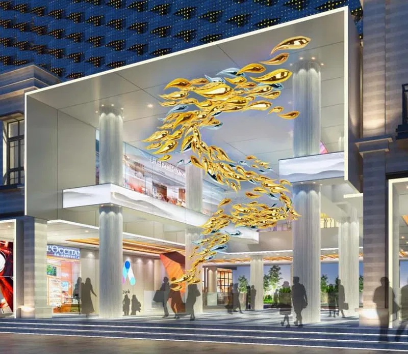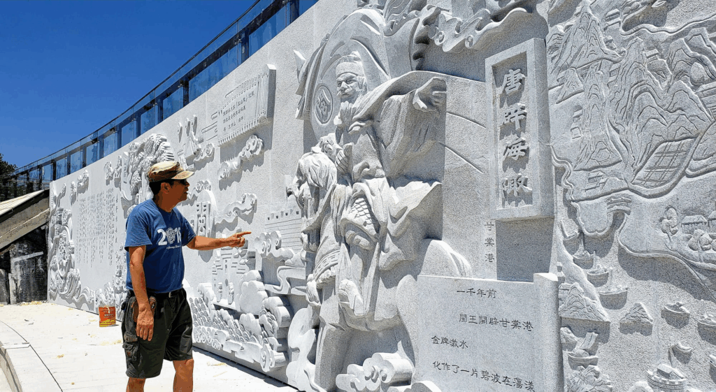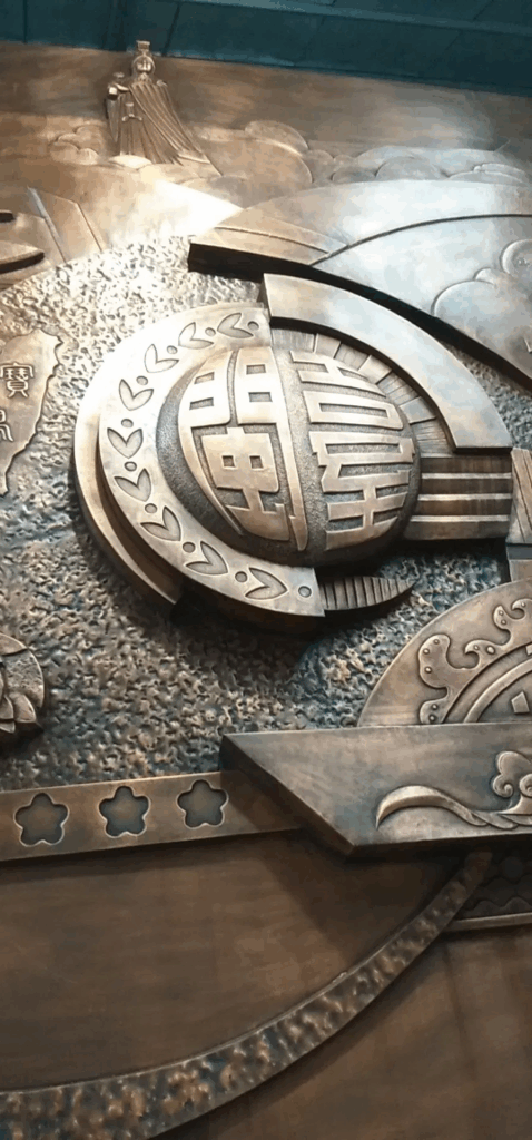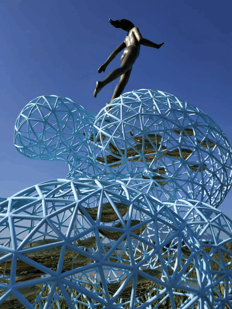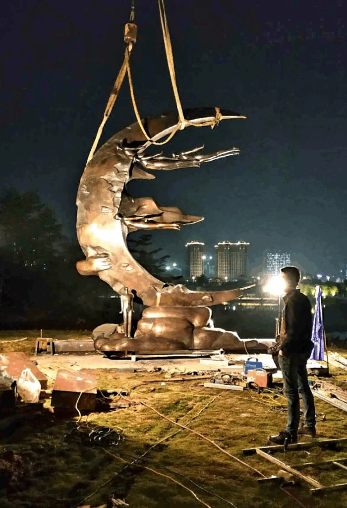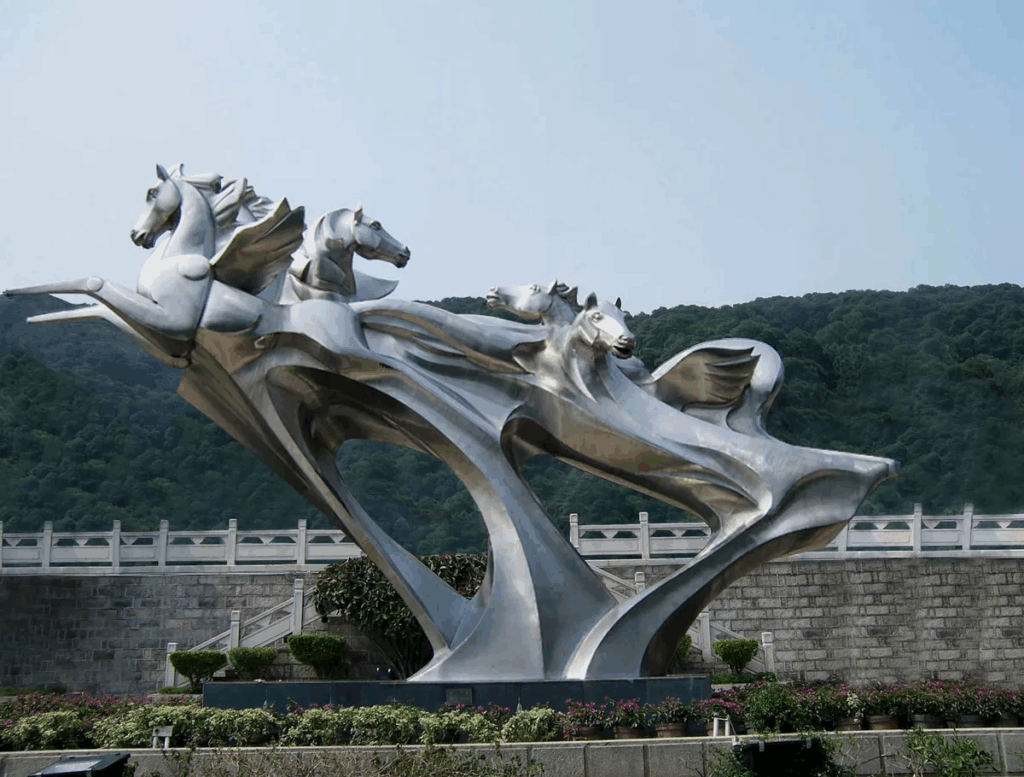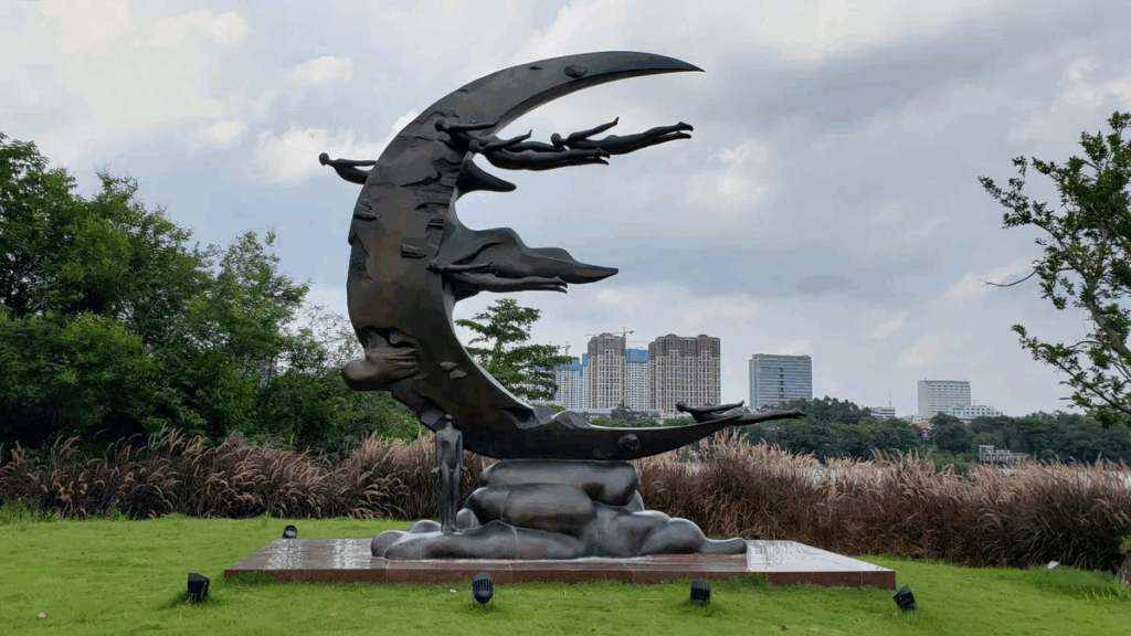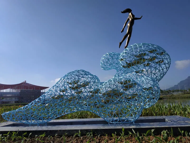 It is one of the symbols of City of Fuzhou. The name of this piece is called “Three Mountains and a River”. It stands 23.8 Meters, and is made from stainless steel.